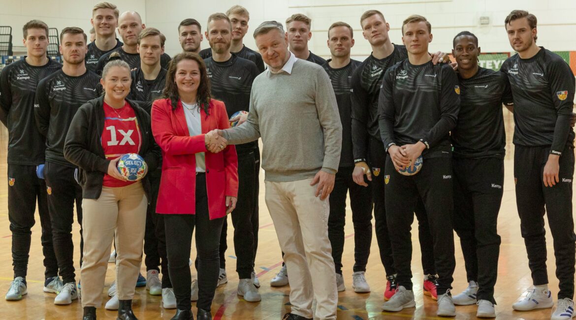 Hrafnhildur Ingólfsdóttir og Hjördís Auðunsdóttir frá 1xINTERNET og Kjartan Vídó Ólafsson, markaðsstjóri HSÍ handsöluðu samninginn milli 1xINTERNET og HSÍ á æfingu hjá A landsliði karla.